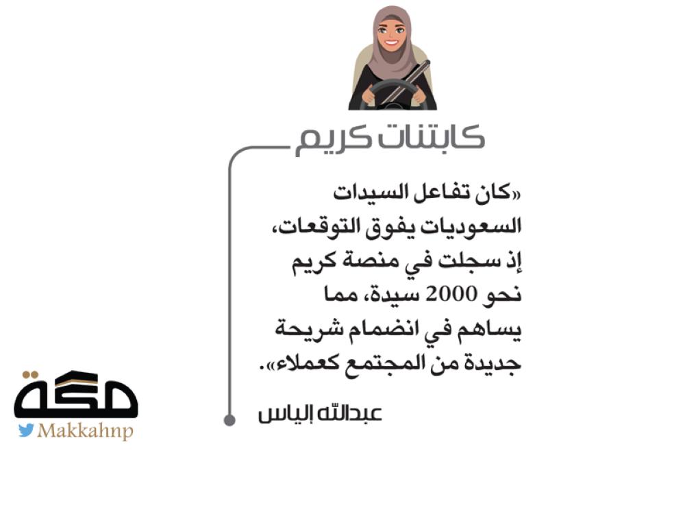 وأكد التزام كريم بضم 20 ألف كابتنة في المنصة بحلول 2020، وقال «كان تفاعل السيدات السعوديات يفوق التوقعات، إذ سجلت في منصة كريم نحو 2000 سيدة، مما يساهم في انضمام شريحة جديدة من المجتمع كعملاء، خاصة ممن يحبذن أن يتنقلن مع سيدة دون الرجل، وها هي الفرصة