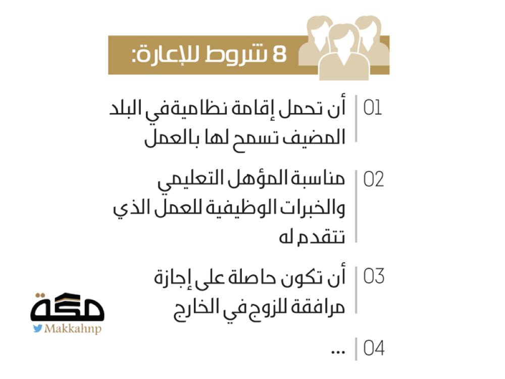 ووفقا لمعلومات حصلت عليها «مكة» فإن أبرز الشروط ألا تقل المدة المتبقية لعمل زوجها عن سنة كاملة من تاريخ بدء طلب التحاقها بالعمل في الأكاديمية أو المدرسة، وكذلك عند تجديد الإعارة.