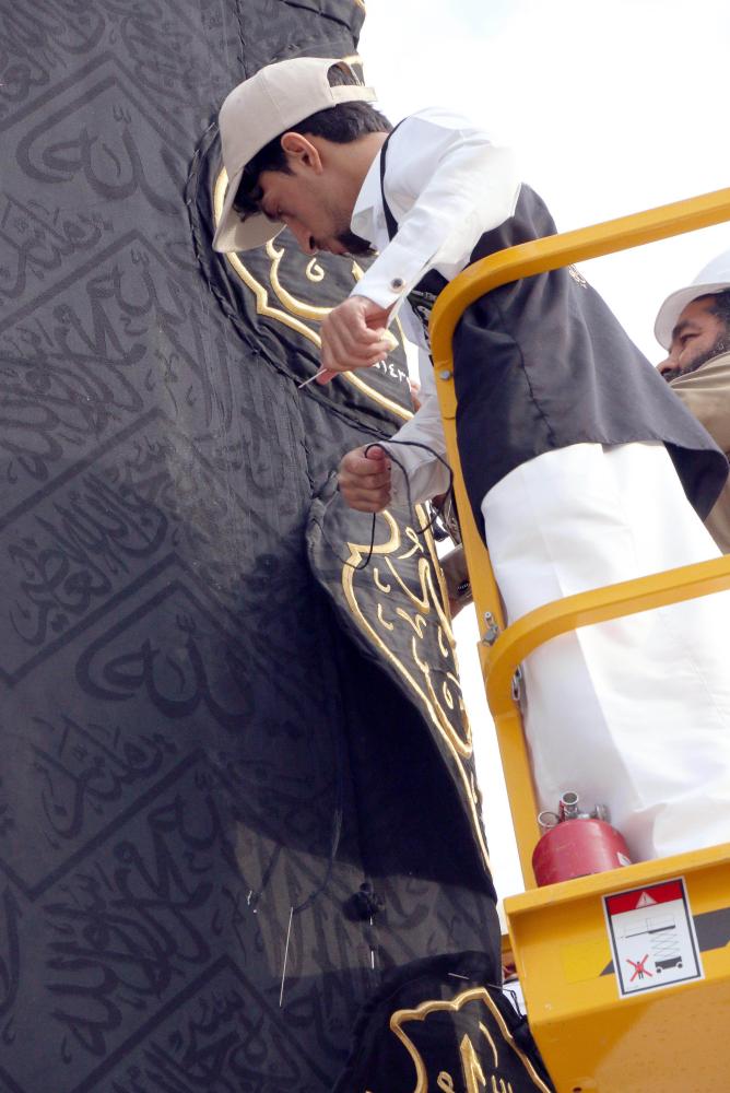 وأضاف: بدأت هذه العملية أولا من جهة الحطيم، لوجود الميزاب الذي له فتحة خاصة به في أعلى الثوب، وبعد أن تم تثبيت كل الجوانب تثبت الأركان بحياكتها من أعلى الثوب إلى أسفله، وبعد الانتهاء من ذلك تم وضع الستارة التي احتاجت إلى وقت وإتقان في العمل، وذلك بعمل فتحة تقدر بمساحة الستارة في القماش الأسود، والتي تقدر بنحو 3،30 أمتار عرضا حتى نهاية الثوب، ومن ثم تم عمل ثلاث فتحات في القماش الأسود لتثبيت الستارة من تحت القماش، وأخيرا تم تثبيت الأطراف بحياكتها في القماش الأسود على الثوب.