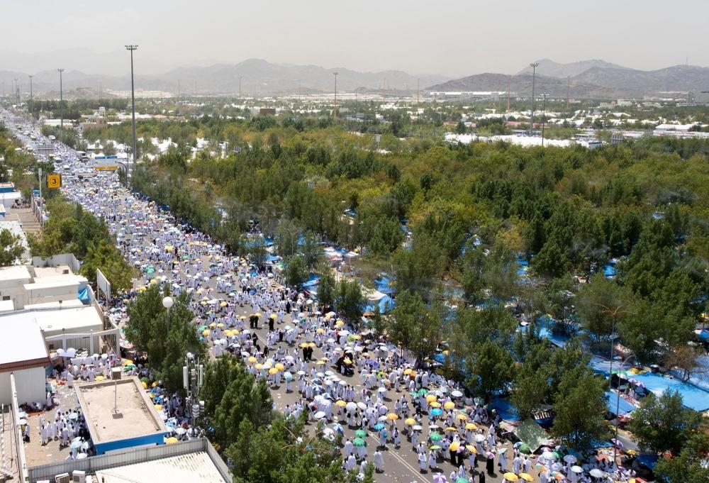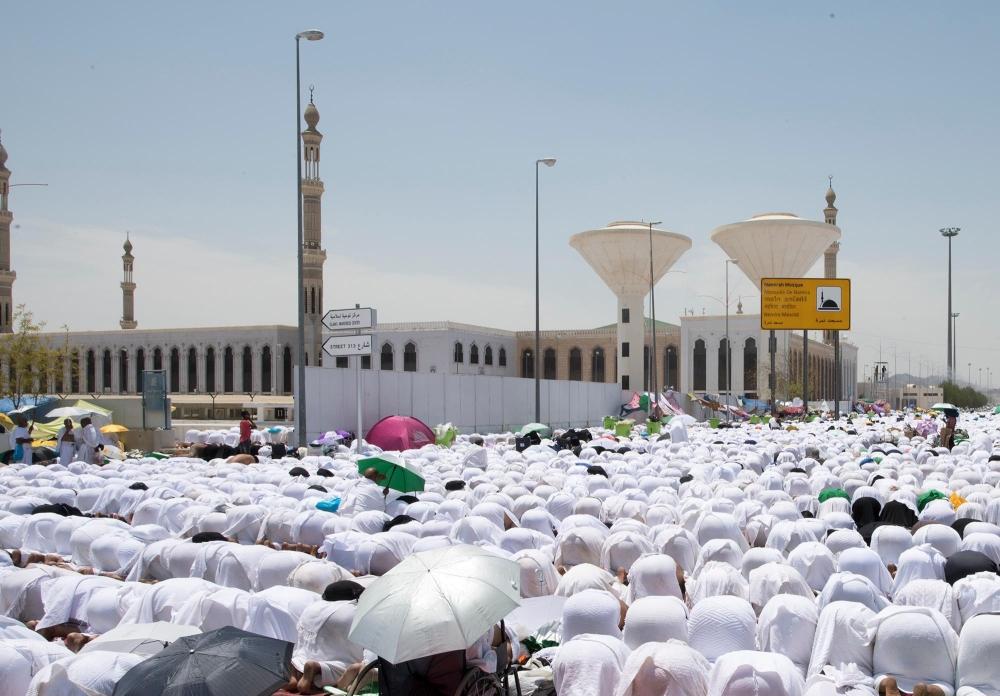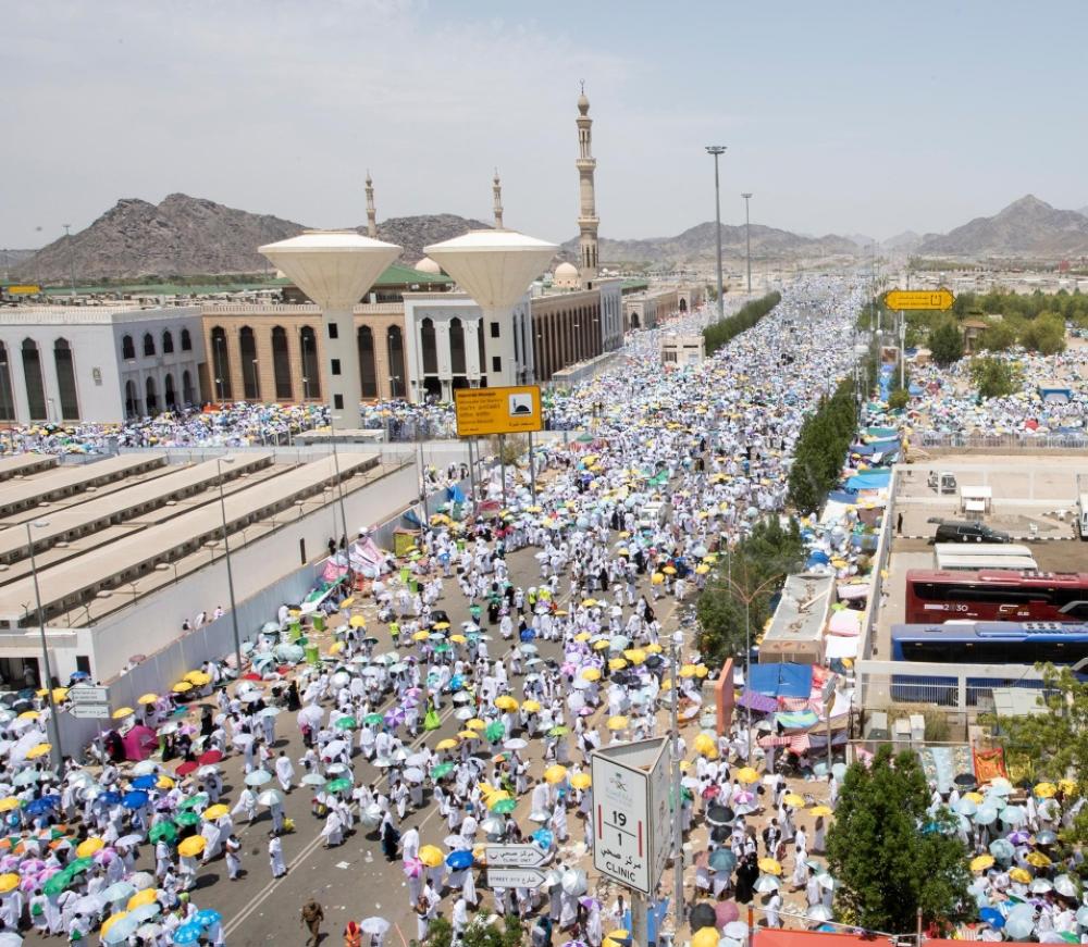 توافد ضيوف الرحمن إلى المسجد لأداء صلاتي الظهر والعصر جمعا وقصرا؛ اقتداء بسنة النبي المصطفى محمد صلى الله عليه وسلم والاستماع لخطبة عرفة، وامتلأت جنبات المسجد الذي تبلغ مساحته 110 آلاف متر مربع والساحات المحيطة به التي تبلغ مساحتها ثمانية آلاف متر مربع بضيوف الرحمن.