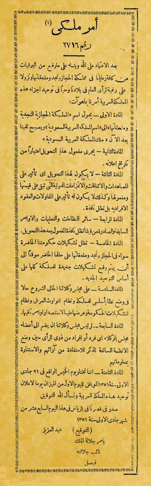 يذكر أن إعلان التوحيد صدر عام 1932 بحسب أمر ملكي صدر من الملك عبدالعزيز - رحمه الله- في قصره بالدرعية، ونشر في الجريدة الرسمية أم القرى، ليكون تذكيرا بأصالة الماضي، وتنبيها للحاضر للوصل إلى المستقبل.