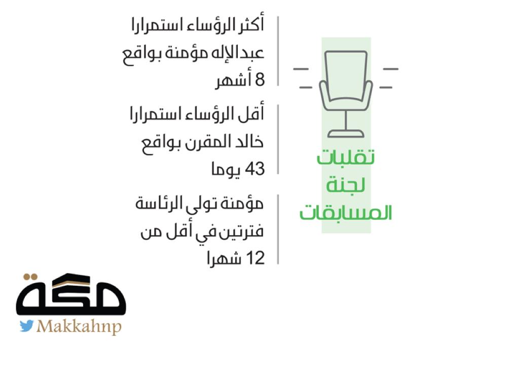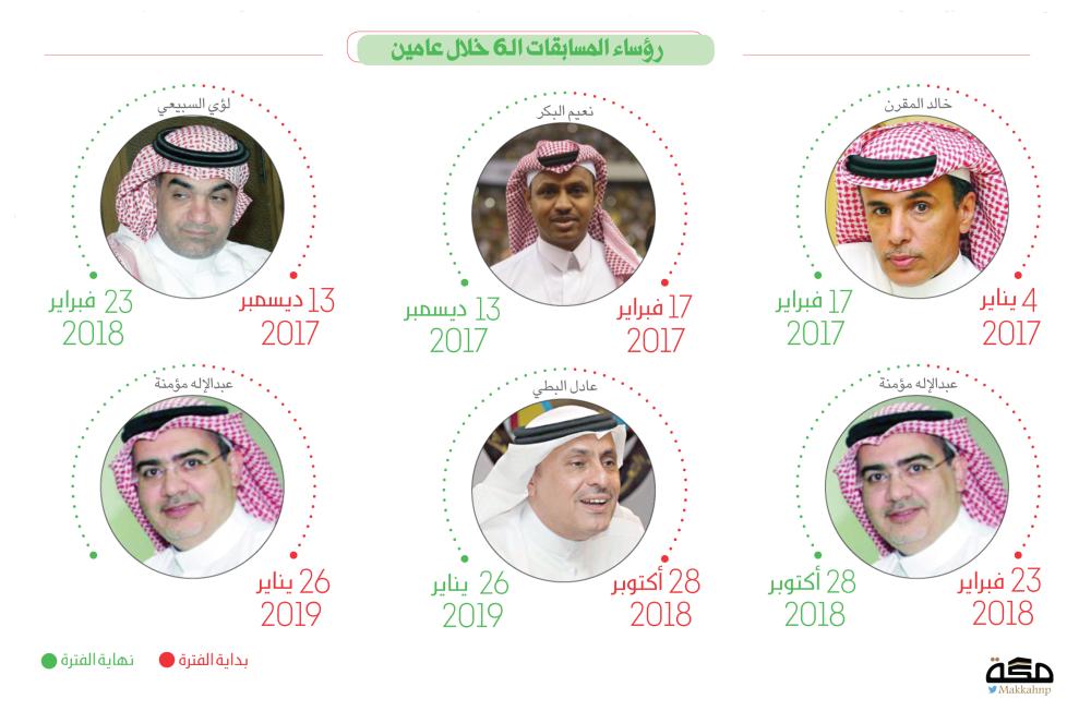 تبادلت 6 شخصيات رئاسة لجنة المسابقات في الاتحاد السعودي لكرة القدم خلال عامين فقط، أي بمعدل رئيس كل 4 أشهر، وهو ما يعكس حالة عدم استقرار إداري في كرة القدم السعودية.
