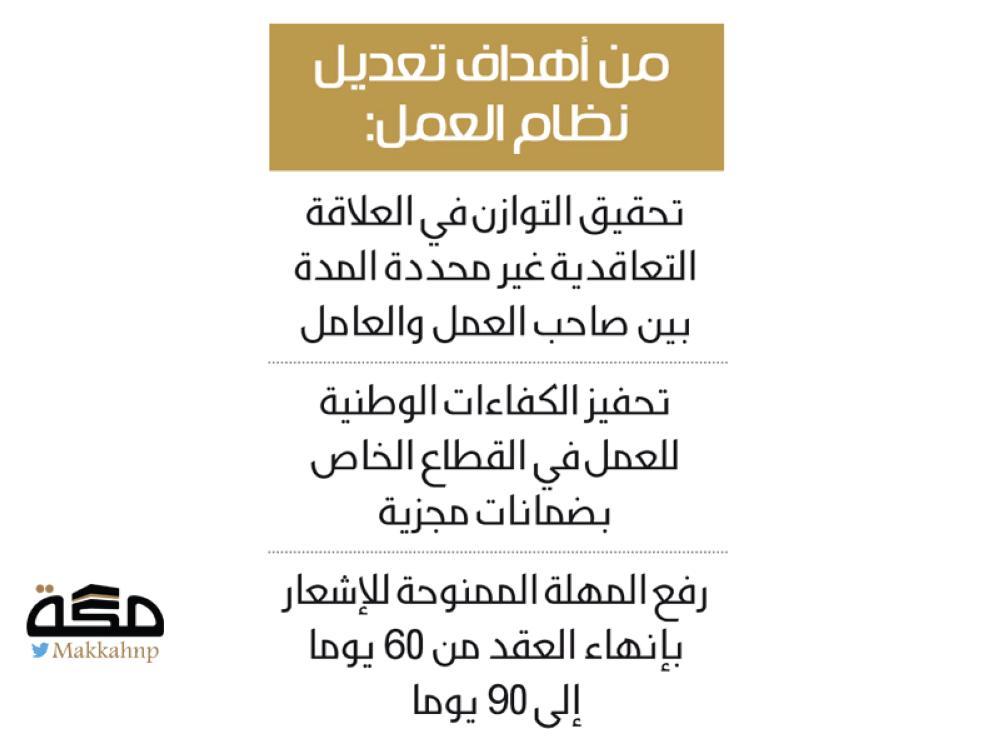- تعديل المهلة الممنوحة لها من العمل للإشعار بإنهاء العقد، وذلك بجعلها 90 يوما بدلا من 60 يوما المنصوص عليها في المادة 75 من نظام العمل