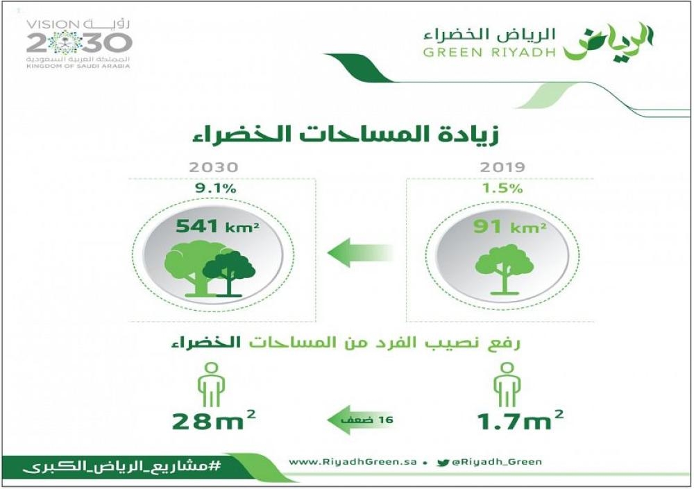 ويهدف المشروع إلى زيادة نسبة المساحات الخضراء من 1.5 % حالياً إلى 9 % من إجمالي مساحة مدينة الرياض ، بما يعادل 541 كيلو متراً مربعاً بعد اتكمال المشروع، ويسهم المشروع في رفع نصيب الفرد في المدينة من المساحات الخضراء من 1.7 متر مربع حالياً إلى 28 مترا مربعا، بما يعادل 16 ضعفاً عما هي عليه الآن.