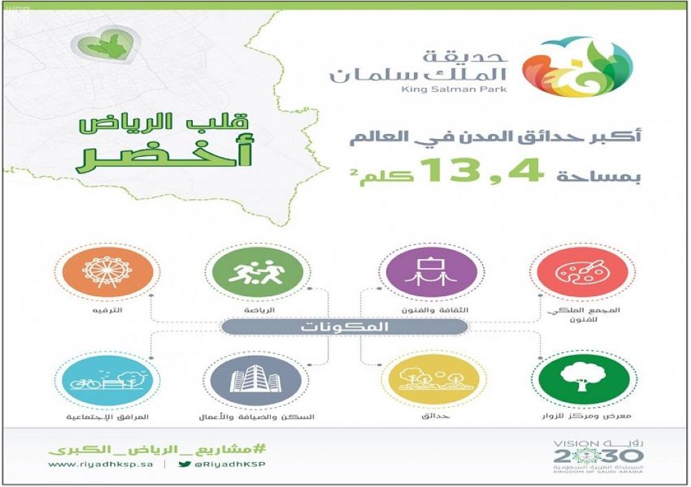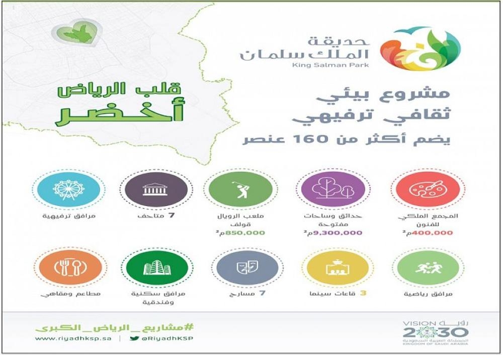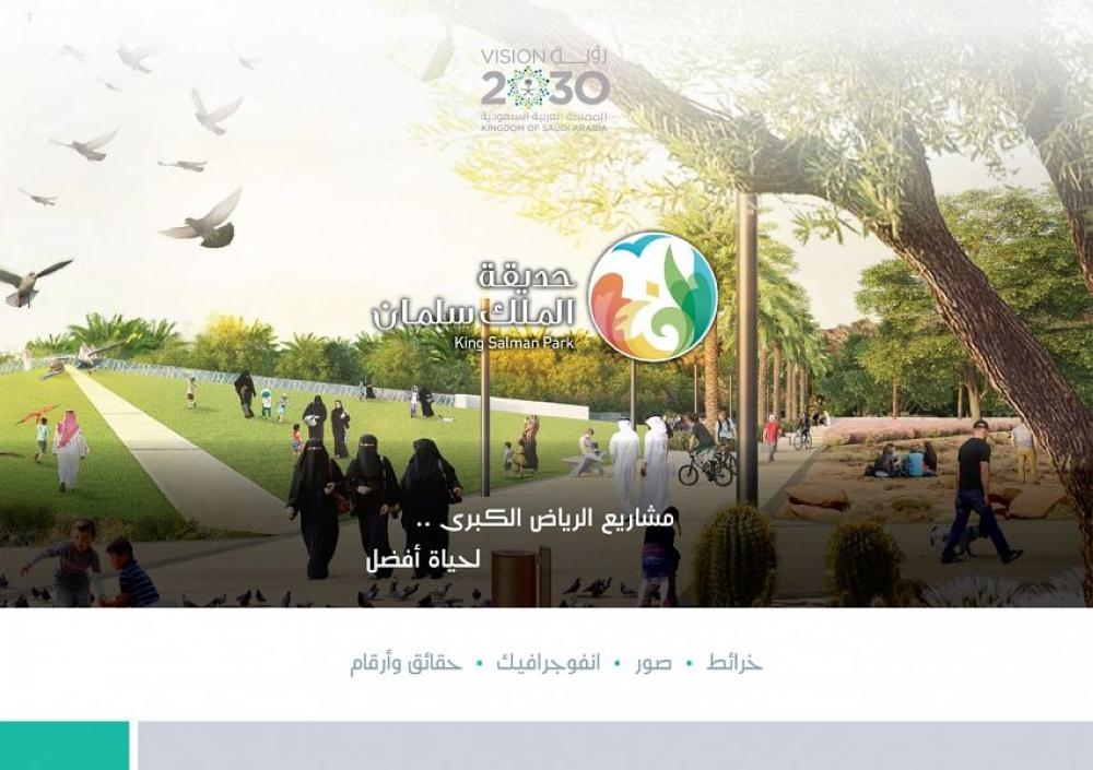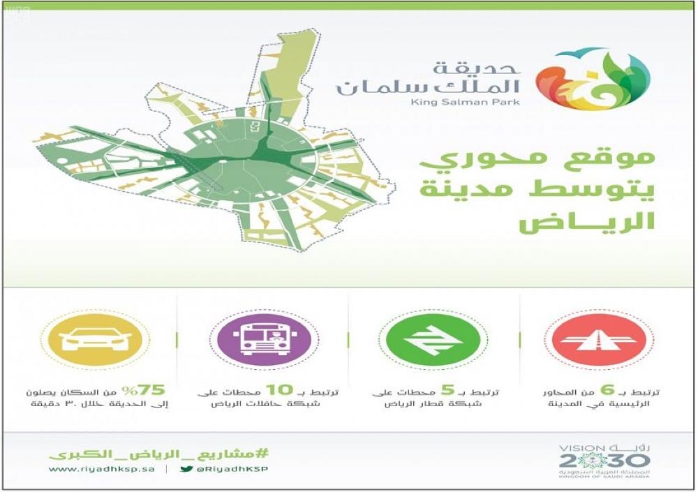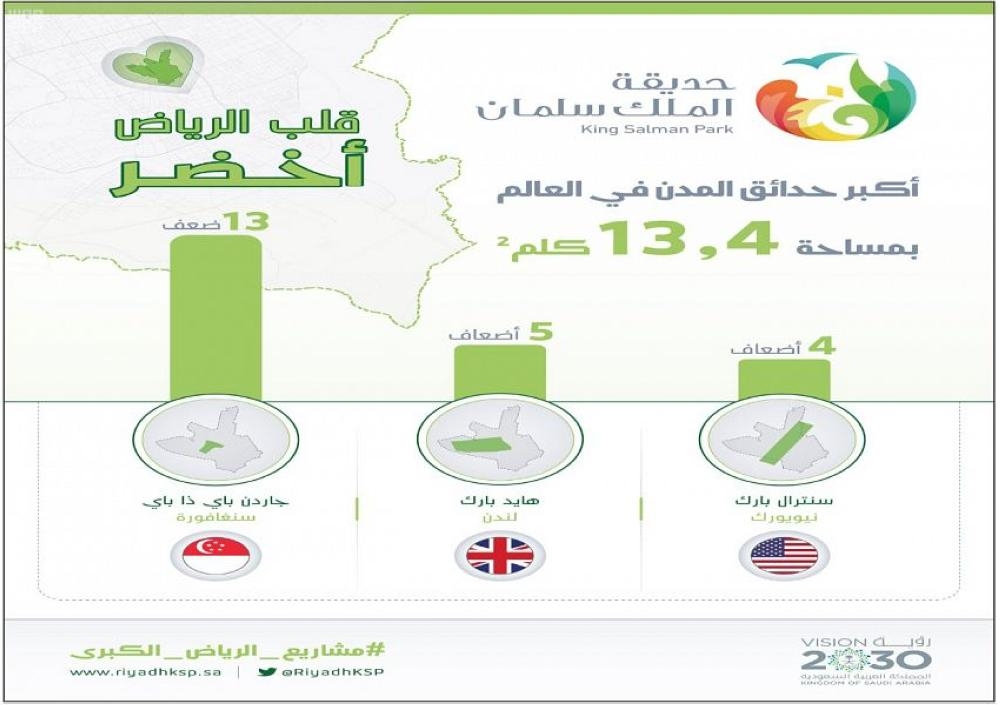 وتأتي "حديقة الملك سلمان" أولى هذه المشروعات المعتمدة ضمن مشروعات الرياض الكبرى، على مساحة تبلغ 13.4 كيلومتراً مربعاً، متخذةً من قلب الرياض موقعاً لها، وتحديداً على أرض قاعدة الملك سلمان الجوية (مطار الرياض القديم)، لتصبح بذلك أكبر حدائق المدن في العالم ، بمساحة تزيد بـ 13 ضعفاً عن "حديقة جاردن باي ذا باي" في سنغافورة، وبخمسة أضعاف عن "حديقة هايد بارك" في لندن، وبأربعة أضعاف أكبر من "حديقة سنترال بارك" في نيويورك، فيما يشكل موقعها أهمية كبيرة كونها تتوسط المدينة الرياض وترتبط بـستة محاور رئيسية وخمسة محطات على شبكة القطار وعشرة محطات شبكة حافلات الرياض بحيث يصل 75% من سكان المدينة إليها في غضون 30 دقيقة.