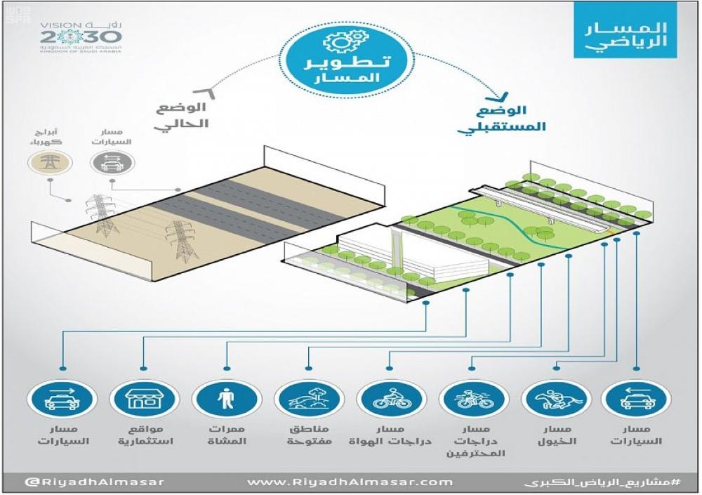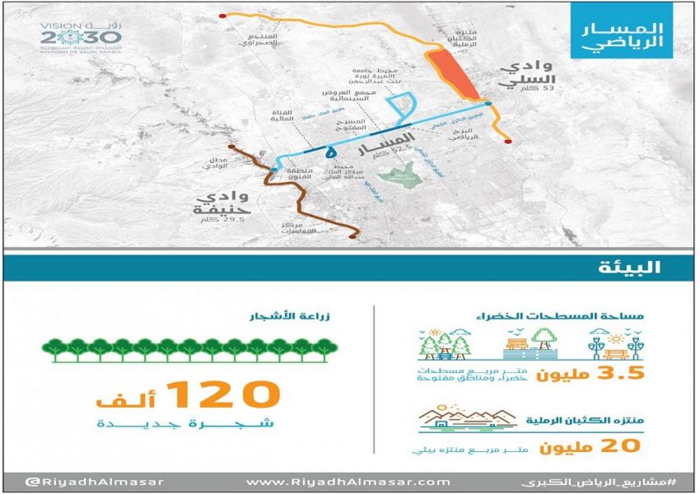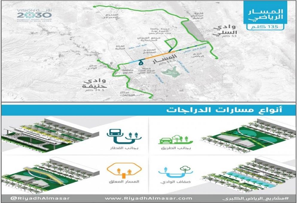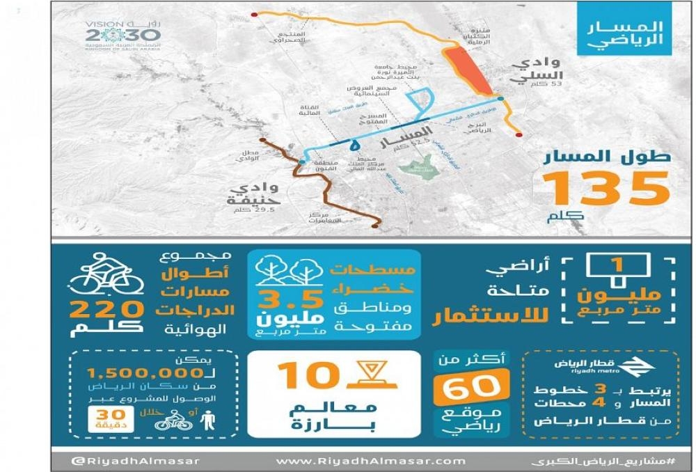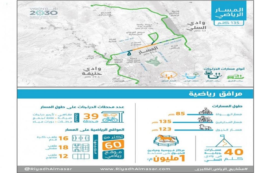 ويربط مشروع " المسار الرياضي " بين وادي حنيفة ووادي السلي ، مع مناطق امتداد للمسار في كل من وادي حنيفة ووادي السلي بإجمالي أطوال للمسارات تصل إلى 135 كيلو متراً ، ويضمن أنشطة رياضية وفنية وثقافية وترفيهية وبيئية ويشمل على: