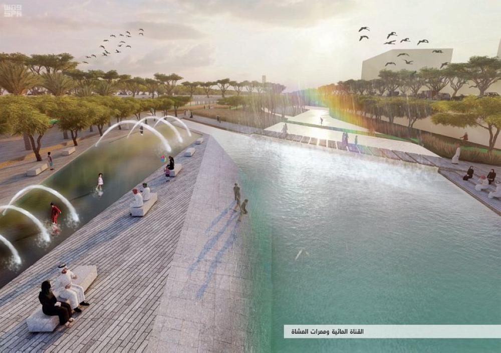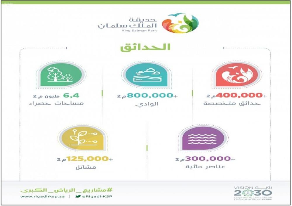 وتنتشر في "حديقة الملك سلمان" مناطق خضراء وساحات مفتوحة تزيد مساحتها عن 9.3 ملايين متر مربع وحدائق متنوعة تبلغ مساحتها 400.000 متر مربع، ومسار دائري للمشاة بطول 7.2 كليو مترات، ومنطقة الواحدي على مساحة 800 ألف متر مربع وعناصر مائية متنوعة.