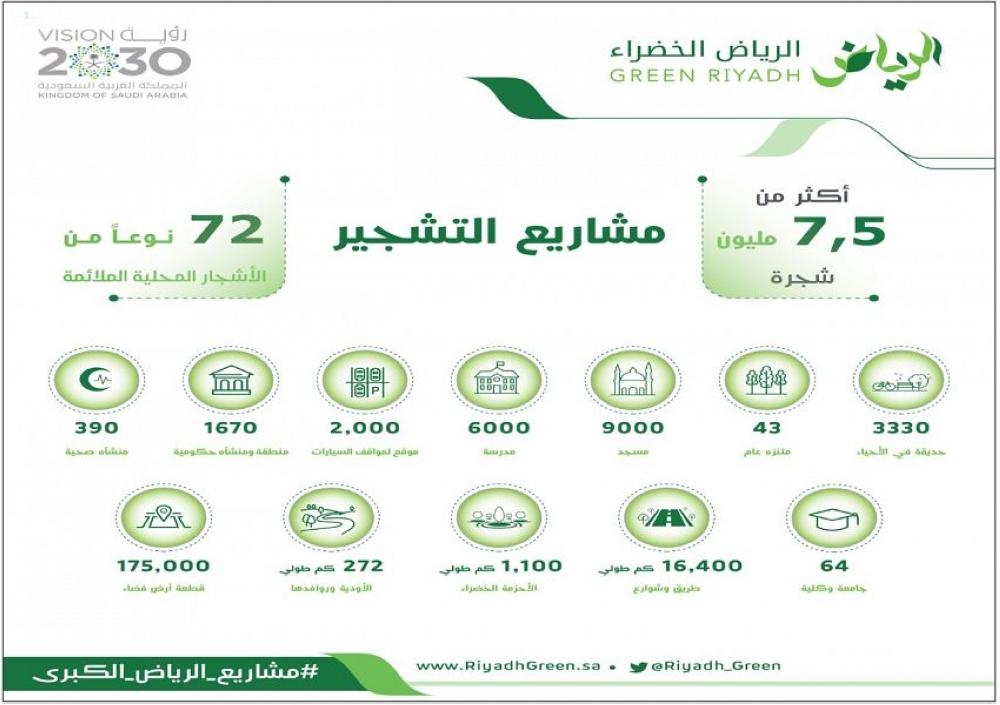 ويعد التشجير أحد أهم النماذج التي سيتم العمل عليها ويشتمل المشروع على زراعة أكثر من 7.5 ملايين شجرة في أنحاء مدينة الرياض كافة ويتضمن المشروع على تشجير العناصر التالية: