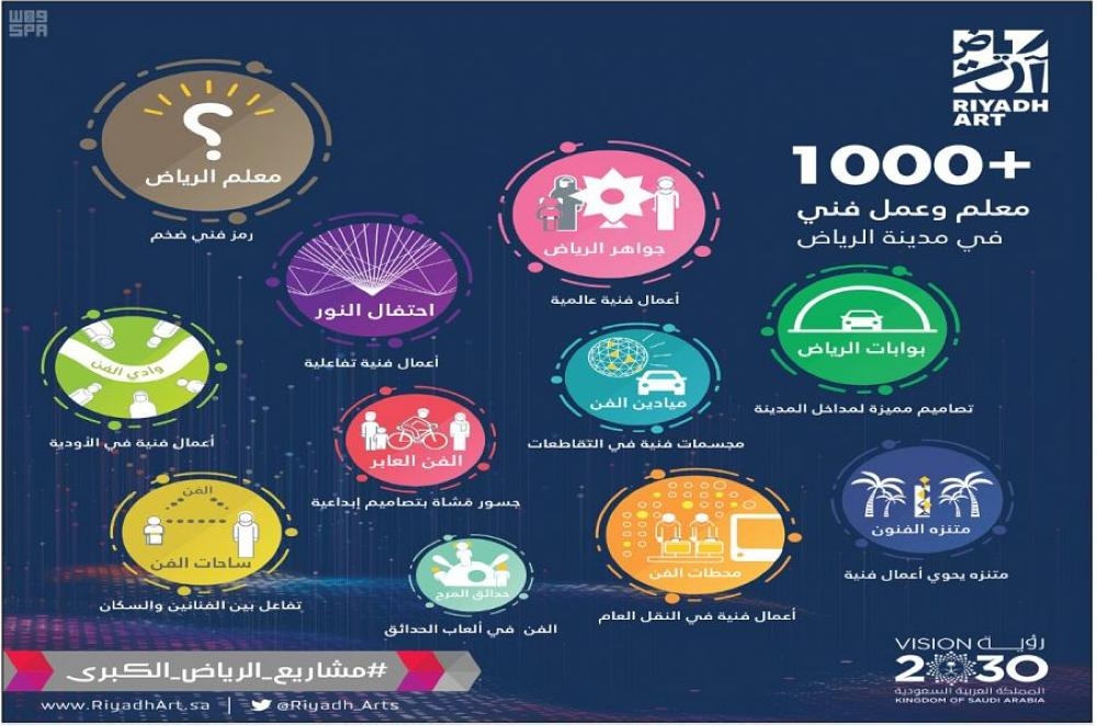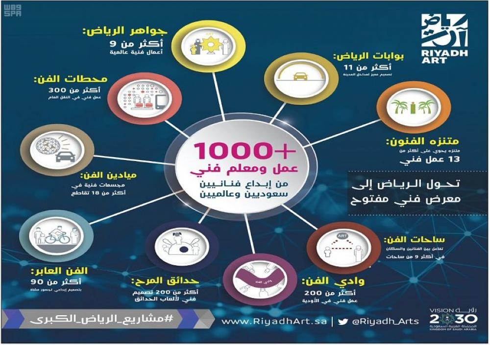 ويشتمل المشروع على تنفيذ أكثر من ألف عملٍ ومعلمٍ فني، في مختلف أرجاء العاصمة الرياض، بالإضافة إلى تنفيذ المعالم والأيقونات الفنية على أيدي مبدعين وفنانين سعوديين وعالميين، ويتضمن المشروع عشرة برامج تغطي: حدائق الأحياء السكنية، والمنتزهات، والميادين، والساحات العامة، ومحطات النقل العام، وجسور الطرق ، وجسور المشاة ، ومداخل المدينة ، والوجهات السياحية كافة.