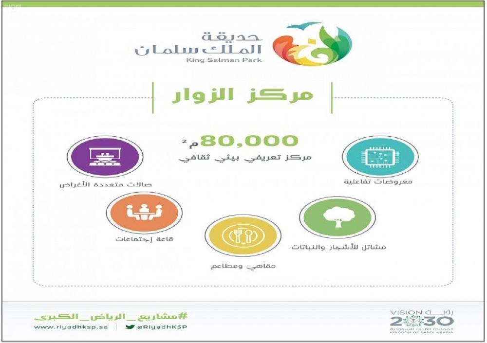 ويتكون مركز الزوار الذي يسهم في التعريف البئي والثقافي على مساحة إجمالية تبلغ 80.000 متر مربع تشمل العروض التفاعلية ومشاتل الأشجار والنباتات ومقاهي ومطاعم وصالات متعددة الأغراض وقاعة اجتماعات.