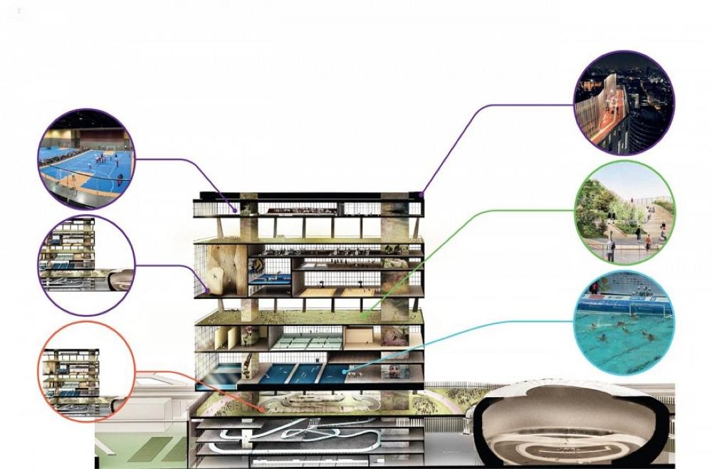 5- المنطقة الرياضية : ويقام ضمن المنطقة الرياضية ملاعب مخصصة للرجال والنساء ، وملاعب وصالات للتدريب على رياضات مختلفة من بينها رياضات : الجري ، الجولف ، الملاكمة ، السلة ، التنس ، الريشة ، السباحة ، كرة الماء ، التسلق ، الرماية ، هوكي الجليد وغيرها كما يتضمن المشروع مضماراً للدراجات الهوائية في الأدوار السفلية ويقام بجوار البرج مضمار مغلق لسباق الدراجات الهوائية تحت منسوب الأرض.