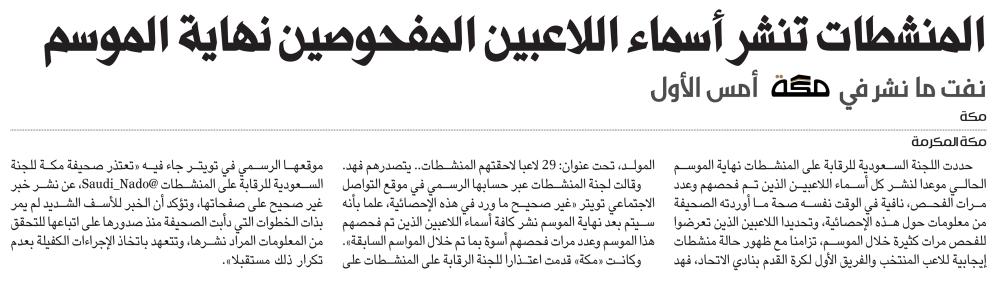 حددت اللجنة السعودية للرقابة على المنشطات نهاية الموسم الحالي موعدا لنشر كل أسماء اللاعبين الذين تم فحصهم وعدد مرات الفحص، نافية في الوقت نفسه صحة ما أوردته الصحيفة من معلومات حول هذه الإحصائية، وتحديدا اللاعبين الذين تعرضوا للفحص مرات كثيرة خلال الموسم، تزامنا مع ظهور حالة منشطات إيجابية للاعب المنتخب والفريق الأول لكرة القدم بنادي الاتحاد، فهد المولد، تحت عنوان: 29 لاعبا لاحقتهم المنشطات.. يتصدرهم فهد. وقالت لجنة المنشطات عبر حسابها الرسمي في موقع التواصل الاجتماعي تويتر «غير صحيح ما ورد في هذه الإحصائية، علما بأنه سيتم بعد نهاية الموسم نشر كافة أسماء اللاعبين الذين تم فحصهم هذا الموسم وعدد مرات فحصهم أسوة بما تم خلال المواسم السابقة». وكانت «مكة» قدمت اعتذارا للجنة الرقابة على المنشطات على موقعها الرسمي في تويتر جاء فيه «تعتذر صحيفة مكة للجنة السعودية للرقابة على المنشطات @Saudi_Nado، عن نشر خبر غير صحيح على صفحاتها، وتؤكد أن الخبر للأسف الشديد لم يمر بذات الخطوات التي دأبت الصحيفة منذ صدورها على اتباعها للتحقق من المعلومات المراد نشرها، وتتعهد باتخاذ الإجراءات الكفيلة بعدم تكرار ذلك مستقبلا».