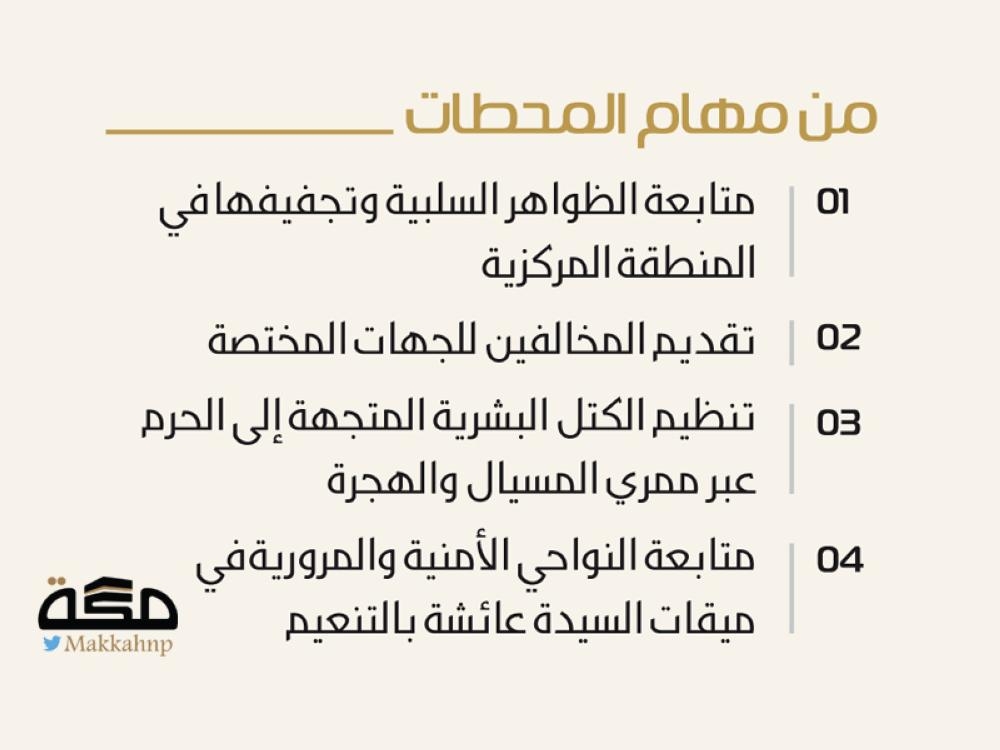 من جهته أفاد قائد مهام شرطة العاصمة المقدسة اللواء فهد العصيمي أن مهام القوة تتمثل في متابعة الأمن والقضايا الجنائية وتقديم الجناة إلى الجهات المختصة، مبينا أن محاور مهام القوة تتمركز حول قيادة قوة أمن المحطات للإشراف على توزيع وتفويج الحجاج عبر المحطات في المنطقة المركزية بشكل كامل والبالغ عددها 7 محطات مدعومة بالضباط والأفراد والآليات وتعمل على تفكيك الحشود المتجهة منها إلى المسجد الحرام والعكس على مدار الساعة، إلى جانب وجود لجان موسمية ودائمة تعمل مع الجهات الحكومية الأخرى، وكذلك وجود لجنة الظواهر السلبية التي تنطوي تحت مظلة إمارة منطقة مكة المكرمة للعمل على متابعة الظواهر السلبية وتجفيفها في المنطقة المركزية وتقديم المخالفين للجهات المختصة، علاوة على تنظيم القوة للحشود والكتل البشرية المتجهة إلى الحرم المكي الشريف عبر ممري المسيال والهجرة، وكذلك متابعة النواحي الأمنية والمرورية في ميقات السيدة عائشة بالتنعيم على مدار الساعة.
