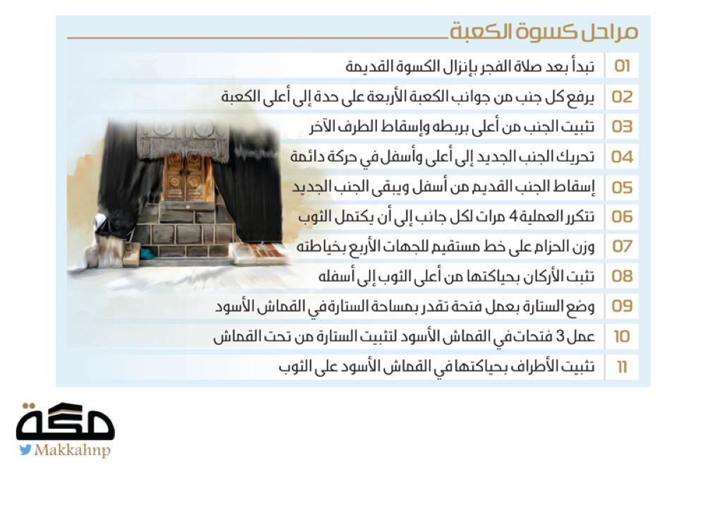 1 يبدأ بعد صلاة الفجر إنزال الكسوة القديمة للكعبة، وإلباسها الكسوة الجديدة المكونة من أربعة جوانب مفرقة وستارة الباب