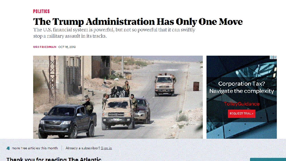 «لا بد أن تتوقف تركيا عن هذا الأمر»، كان هذا عنوان افتتاحية مجلة «ذي أتلانتك» الأمريكية، وهي الرغبة التي تجتاح كل الأمريكيين تجاه الاعتداء التركي على شمال شرق سوريا بتسهيلات أمريكية.