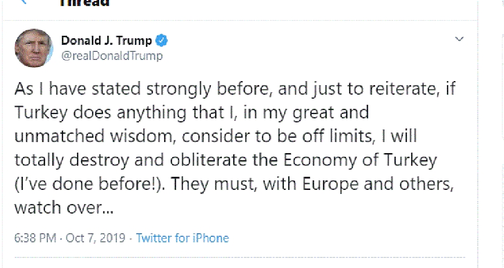 ويضيف الباحث التركي أن إردوغان يتوقع أن ترمب سينقذ العلاقة في النهاية، كما هو الحال في الصيف الماضي حينما تراجع الرئيس الأمريكي عن فرض عقوبات على تركيا، بسبب شراء تركيا لمنظومة دفاع صاروخية روسية. ويضيف الباحث التركي أن إردوغان يراهن على ذلك مرة أخرى، حيث إن ترمب سيمنع العقوبات المدمرة ضد اقتصاد وجيش تركيا بعد الاجتياح التركي.