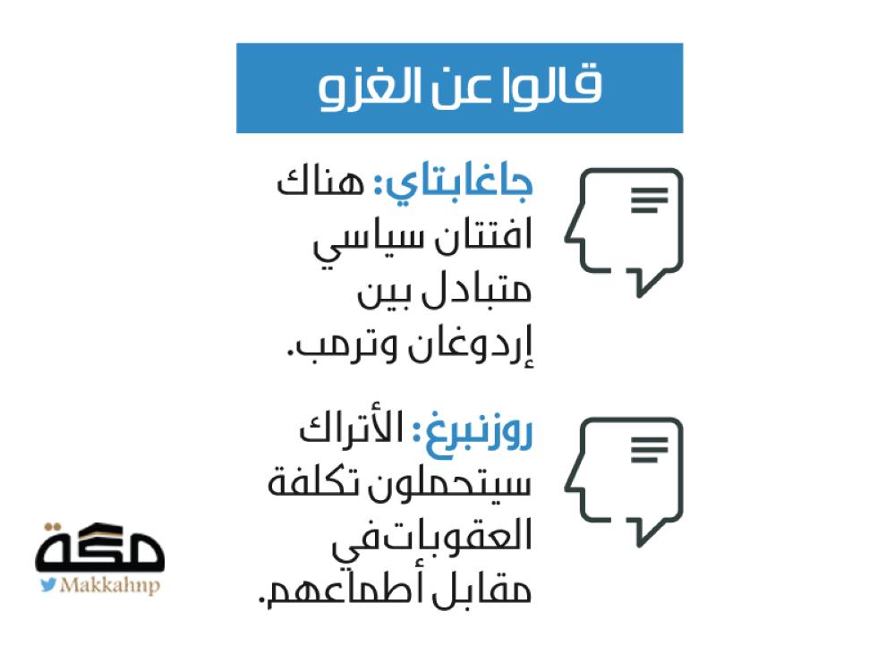 وأضاف المسؤول «ربما وضع إردوغان في حسبانه مسألة العقوبات الاقتصادية أثناء اتخاذه قرار المضي في هجومه في سوريا»، إذ أكد سونر جاغابتاي، وهو باحث تركي في معهد واشنطن لسياسة الشرق الأدنى ومؤلف كتاب «إمبراطورية إردوغان» أن الرئيس التركي توقع العقوبات الأمريكية على الأغلب، مشيرا إلى وجود علاقة جيدة بين إردوغان وترمب إلى درجة وجود افتتان سياسي متبادل بينهما، بوصفهما رئيسين قويين متماثلين في التفكير، على حد تعبيره.