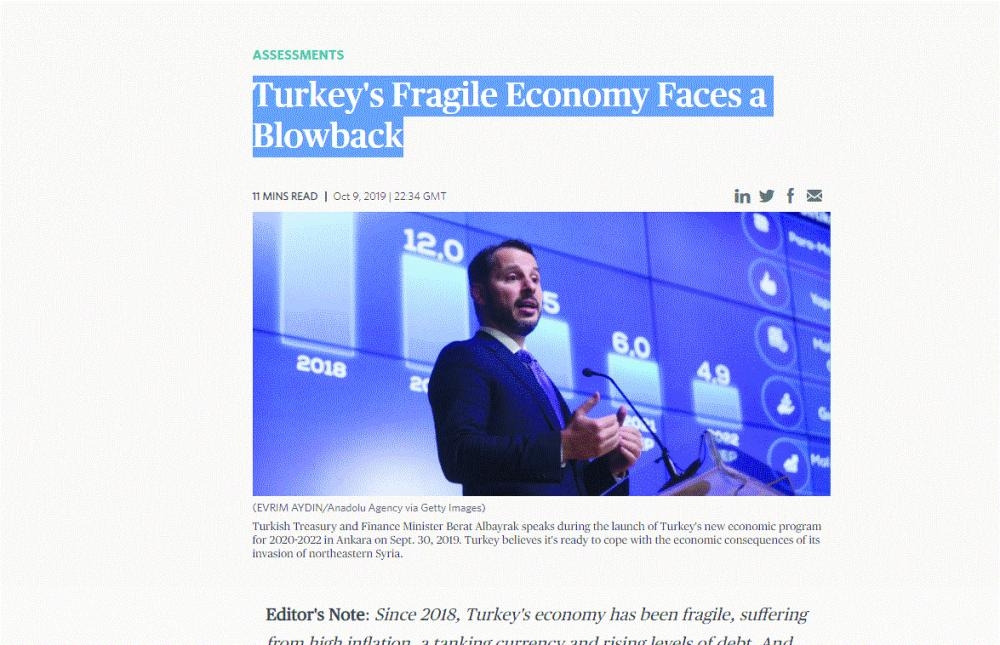 لا يزال الاقتصاد التركي هشا في ظل الأوضاع الراهنة، ففي منتصف أغسطس 2018 انخفضت العملة التركية إلى 6.95 ليرات مقابل الدولار الأمريكي، لكنها استقرت منذ ذلك الحين، وبعدما شنت أنقرة هجومها على شمال شرق سوريا بعد ظهر يوم 9 أكتوبر الجاري، لم تنخفض العملة إلا بشكل طفيف إلى حوالي5.87 ليرات مقابل الدولار.