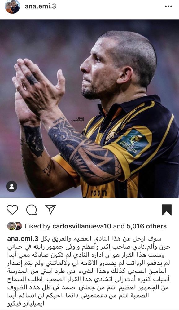 واستمر إيميليانو في نشر الغسيل، وقال إن أصحاب القرار في النادي لم يكونوا صادقين معه ولم يمنحوه الرواتب، كما لم يصدروا له الإقامة ولعائلته التي بموجبها يصدر التأمين الطبي، الأمر الذي انعكس سلبيا على ابنته، مما أدى إلى طردها من المدرسة. وأكد اللاعب عبر حسابه الشخصي في موقع التواصل الاجتماعي (انستقرام)، أن هناك عدة أسباب إضافية جعلته يتخذ هذا القرار الصعب في هذا التوقيت.