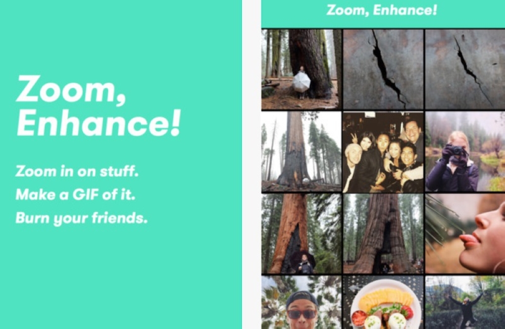 وتطبيق Zoom, Enhance المتوفر لمستخدمي أجهزة ايفون يتيح إمكانية إنتاج صور متحركة بصيغة GIF تعتمد على مبدأ التقريب على جزء محدد في الصورة، بحيث يمكن ببساطة وضع أي صورة وعمل زوم بداخلها لتركيز نظر المشاهد على جزء محدد.