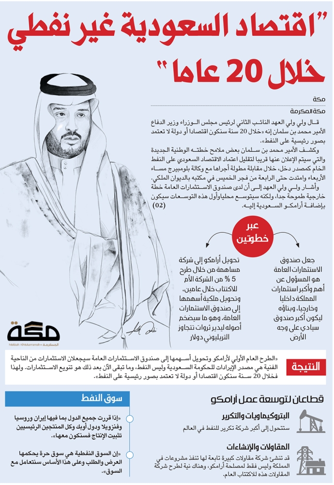 كشف ولي ولي العهد النائب الثاني لرئيس مجلس الوزراء وزير الدفاع الأمير محمد بن سلمان عن بعض ملامح خطته الوطنية الجديدة والتي سيتم الإعلان عنها قريبا لتقليل اعتماد الاقتصاد السعودي على النفط الخام كمصدر دخل والتي من المفترض أن تؤتي ثمارها خلال 20 عاما.