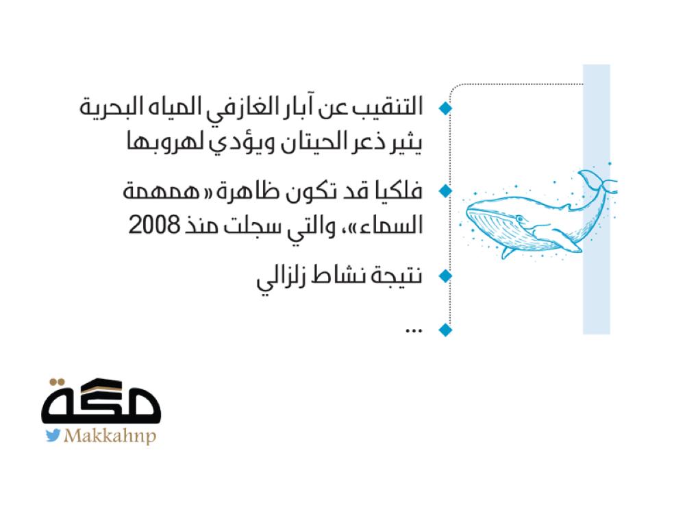 وفي السياق نفسه أكد الخبير والاستشاري في مجال تقييم الآثار البحرية أحمد جاد لـ»مكة»، أنه من خلال دراسات تقييم الأثر البيئي لمشروعات التنقيب عن آبار الغاز في المياه البحرية العميقة باستخدام المسح السيزمي ثبت أن من أحد أهم تلك الآثار البيئية حدوث هروب لبعض أنواع الحيتان واقترابها من الشواطئ في أماكن ليس من المعتاد أن تأتي إليها.