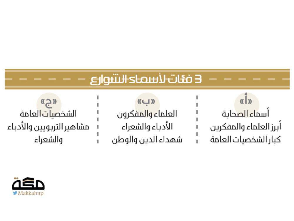 وبين أن شوارع فئة «أ» توضع أسماؤها على الشوارع التي بين المحورية الكبرى، وتتضمن أسماء الصحابة، رضوان الله عليهم، وكبار الشخصيات العامة على مستوى البلاد في شتى فروع الحياة السياسية والاقتصادية والعلمية.