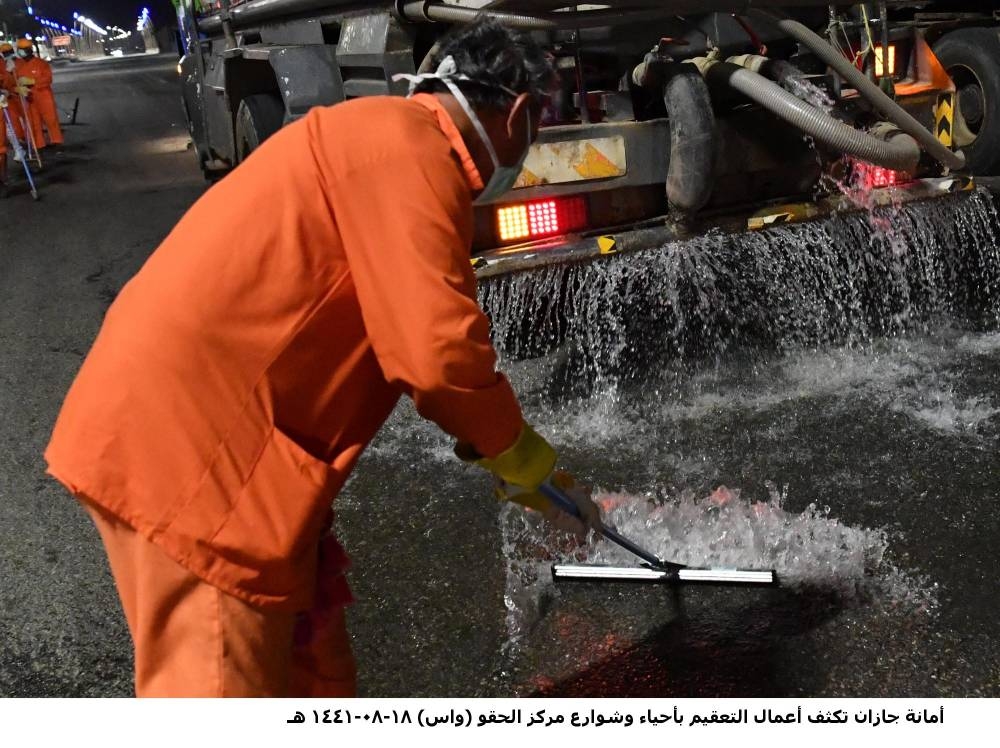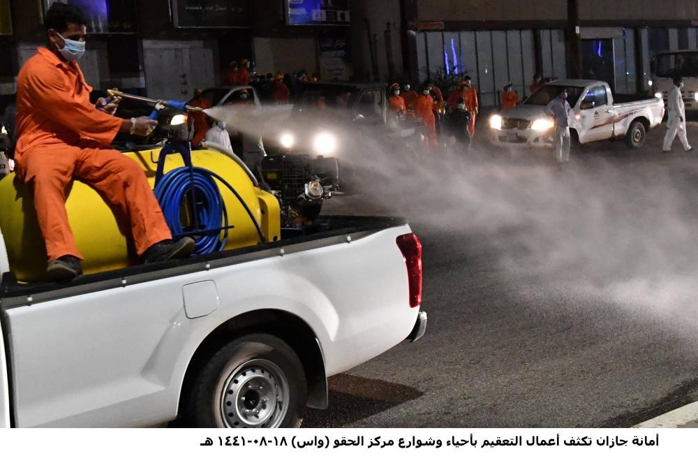 كثفت أمانة منطقة جازان وبلدية مركز الحقو بمحافظة بيش أمس، من أعمال التعقيم والتطهير للطرق والشوارع والأحياء والمرافق العامة لضمان الصحة العامة وسط التزام من المواطنين والمقيمين بأمر منع التجول للمحافظة على سلامتهم، وللحد من انتشار فيروس كورونا.