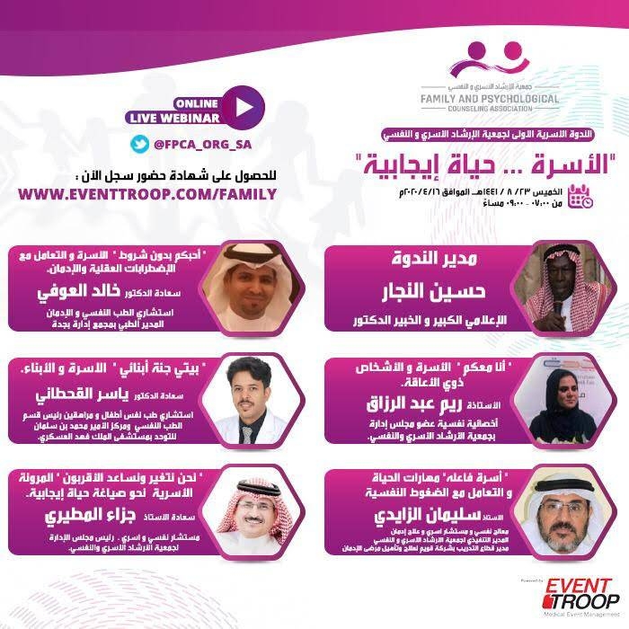 وأشار نائب رئيس مجلس إدارة الجمعية الدكتور جبران يحيى إلى الندوة التي يديرها الإعلامي الكبير الدكتور حسين نجار والإعلامي الدكتور عبدالحميد خوجه، ويقدمها مجموعة من المختصين والخبراء في المجال الأسري والنفسي، وتحتوي على مجموعة من عناوين المحاور المتناولة، حيث يقدم محور كيف تتعامل الأسرة مع المريض العقلي أو النفسي أو المدمن استشاري الطب النفسي والإدمان المدير الطبي لمجمع إرادة الصحة النفسية، الدكتور خالد العوفي، ومحورا خاصا بتقدير ذوي الإعاقة تقدمه الأخصائية النفسية عضوة الجمعية الأستاذة ريم عبدالرزاق، ويقدم محور كيفية التعامل مع الأبناء المتذمرين من الحجر الصحي استشاري الطب النفسي للأطفال والمراهقين الدكتور ياسر القحطاني، بالإضافة إلى ذلك يتحدث المختص في العلاج النفسي والإدمان المدير التنفيذي للجمعية سليمان الزايدي، عن التغييرات والصراعات الطارئة التي تظهر نتيجة الحجر الصحي وكيفية حلها، ويختم رئيس مجلس إدارة الجمعية جزاء المطيري الندوة بالحديث عن محور المرونة الأسرية نحو صياغة الحياة، وكيف نحافظ على ثمار الحجر وإيجابياته.