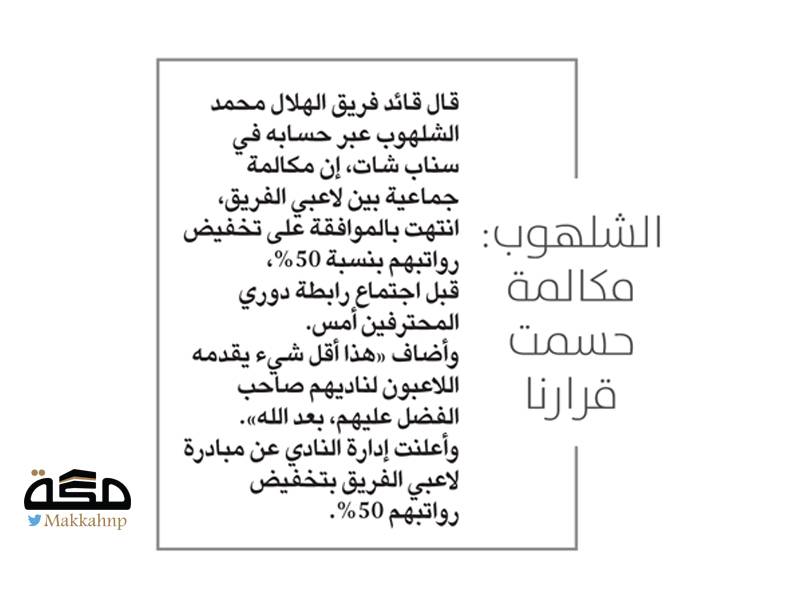 وتم الاتفاق بالإجـمـاع بين أعضاء المجلـس، على الـبدء بالتفاوض مع اللاعبين والمدربين وأعضاء الجهاز الفني بشأن تخفيض الرواتب بنسبة 50%، على أن يلتزم النادي بحد أدنى للرواتب لا يقل عن 20 ألف ريال، أو ما يعادلها خلال فترة تعليق منافسات كرة القدم.