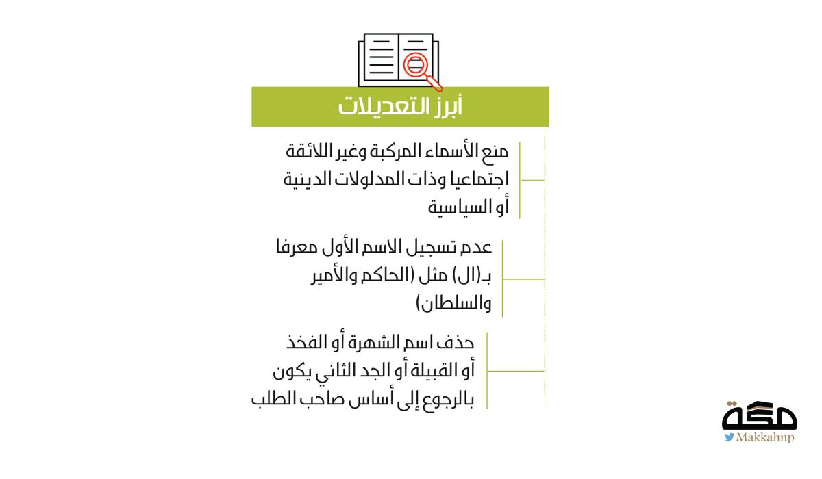 وشملت التعديلات 59 بندا من مواد اللائحة التنفيذية لنظام الأحوال المدنية، وتنوعت ما بين تعديل وإضافة وحذف لبعض البنود، ومنها تغيير الاسم الأول لمن كان عمره أقل من 18عاما بموجب إقرار من والديه أو تفويض منهما عن طريق المنصة الالكترونية، أو وكالة خاصة، أو عن طريق وليه الشرعي.