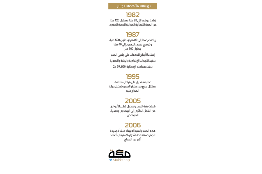 • هدم الجسر واستبداله ببناء منشأة جديدة للجمرات متعددة الأدوار، لاستيعاب أعداد أكبر من الحجاج