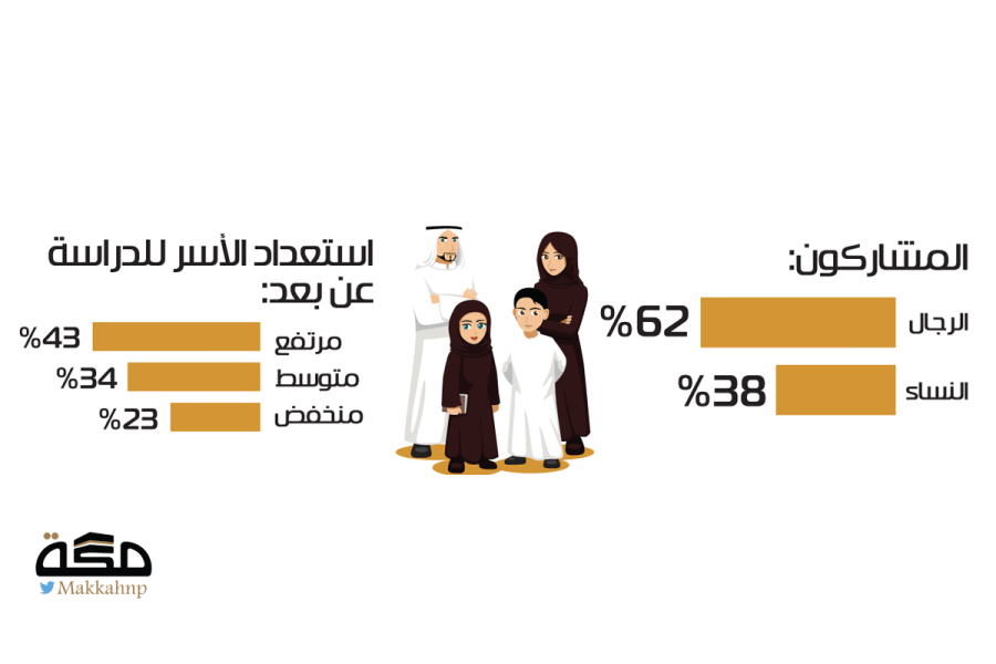 أظهر استطلاع أجراه المركز الوطني لاستطلاعات الرأي العام أخيرا أن 23% من الأسر لديها استعداد منخفض للتعليم عن بعد، مقابل 43% من الأسر لديها استعداد مرتفع، بينما 5% أفادت بعدم توفر أجهزة تقنية لديها.