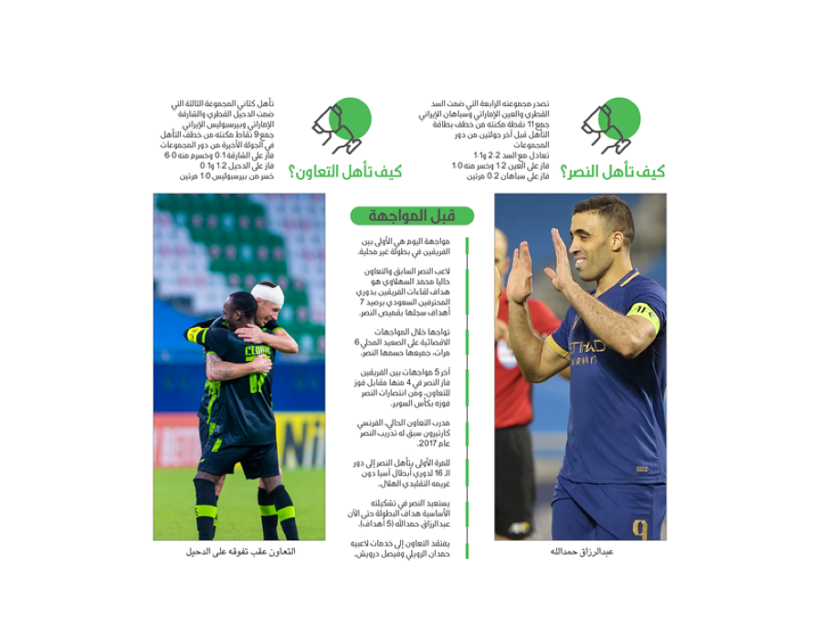 من جانبه، نجح التعاون بقيادة مدربه المنقذ، الفرنسي كارتيرون في خطف تأهل مثير مرورا بمراحل متقلبة، فبعد أن كان متصدرا لمجموعته قبل فترة جائحة كورونا بواقع 6 نقاط، تراجع إلى المؤخرة قبل أن يخطف فوزا ثمينا من متصدر المجموعة الدحيل القطري ويتأهل على حسابه.