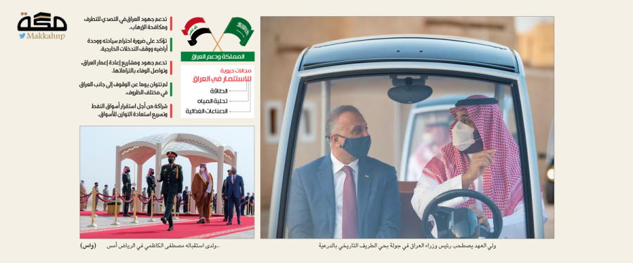 وتحرص المملكة بقيادة خادم الحرمين الشريفين وولي عهده على وحدة الشعب العراقي الشقيق، وعلى التعاون مع الحكومة العراقية الجديدة بقيادة رئيس الوزراء مصطفى الكاظمي، لتحقيق المصالح المشتركة، وتعزيز العلاقات الثنائية بين البلدين الشقيقين بما يحقق الأمن والاستقرار للمنطقة. كما تنظر المملكة بتقدير بالغ إلى أهمية زيارة رئيس الوزراء العراقي بما يحمله ذلك من معان ودلالات سياسية، تعكس إيمان الحكومة العراقية بأهمية العمق العربي والإسلامي والثقل الكبير الذي تمثله المملكة.