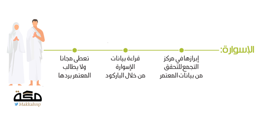 في حين تسلم وزارة الحج والعمرة المعتمر القادم من الخارج إسوارة خاصة به والتأكد من ارتدائها خلال وجوده في مركز عناية بمكة المكرمة، أوضح المتحدث الرسمي لوزارة الحج والعمرة المهندس هشام سعيد لـ«مكة»، أن الإسوارة تعطى للمعتمر دون أي رسوم ولا يطالب المعتمر بإرجاعها إلى مركز عناية.