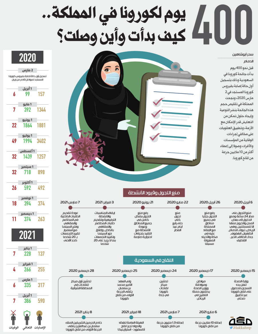 قبل نحو 400 يوم بدأت جائحة كورونا في السعودية وذلك بتسجيل أول حالة إصابة بفيروس كورونا المستجد في 2 مارس 2020، ونجحت المملكة في تقليص حجم هذه الجائحة بنشر التوعية وإيجاد حلول تمكن من التعايش قدر الإمكان مع الأزمة، وتطبيق العقوبات على مخالفي إجراءات الوقاية من المؤسسات والأفراد، وصولا إلى إعطاء أكثر من 10 ملايين جرعة من لقاح كورونا.