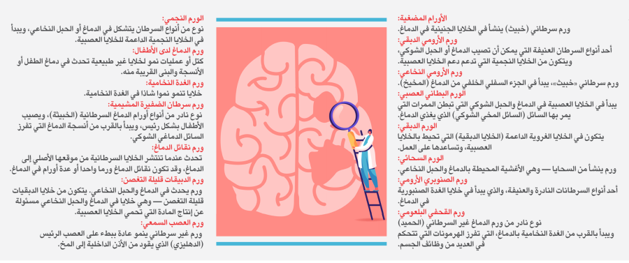 يعرف ورم الدماغ بكونه نموا للخلايا الشاذة التي تصنف إلى نوعين حميدة أو خبيثة، تختلف سرعة نموها من نوع لآخر، ويحدد معدل النمو وموضع الورم مدى تأثيره على وظيفة الجهاز العصبي، وتعتمد خيارات العلاج على نوع الورم إضافة إلى موقعه وحجمه. وحدد موقع مايوكلينك نحو 15 نوعا من أورام الدماغ.