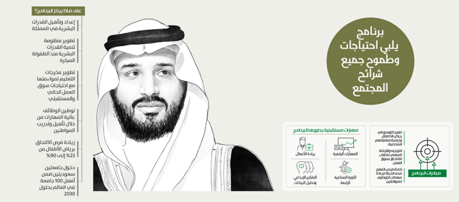 وقال ولي العهد «لثقتي بقدرات كل مواطن، فقد تم تطوير هذا البرنامج ليلبي احتياجات وطموح جميع شرائح المجتمع، من خلال تطوير رحلة تنمية القدرات البشرية بداية من مرحلة الطفولة، مرورا بالجامعات والكليات والمعاهد التقنية والمهنية، وصولا إلى سوق العمل، بهدف إعداد مواطن طموح يمتلك المهارات والمعرفة، ويواكب المتغيرات المتجددة لسوق العمل، مما يسهم في بناء اقتصاد متين قائم على المهارات والمعرفة وأساسه رأس المال البشري».