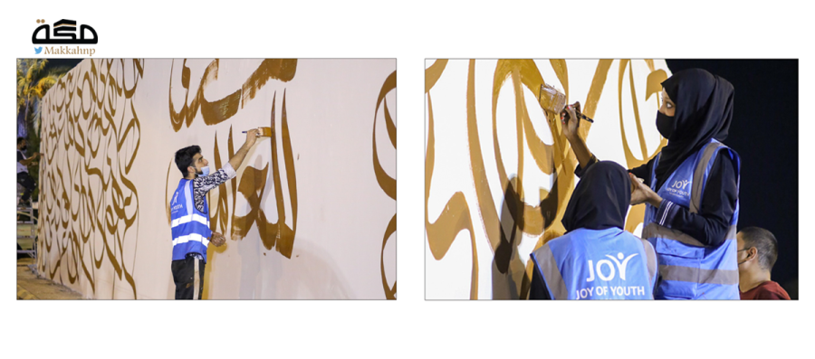 عمل فني على جدارية في طريق الدائري الثالث بالعاصمة المقدسة، ضمن إحدى مبادرات الأمانة لمعالجة التشوه البصري، عمل عليها 50 متطوعا ومتطوعة من فريق «حيث الإنسان أولا».