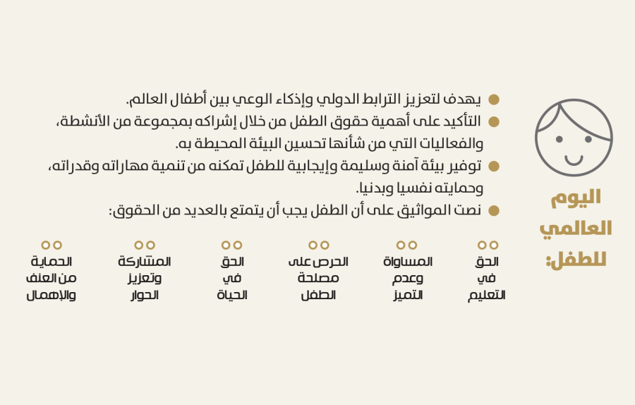 تشارك وزارة التعليم في الاحتفال باليوم العالمي للطفل الذي يصادف 20 نوفمبر من كل عام؛ لتوعية المجتمع بأهمية تنمية مهارات وسلوكيات الأطفال، وإعدادهم لبناء شخصية أكثر تفاعلا واستدامة مع تطورات المستقبل.
