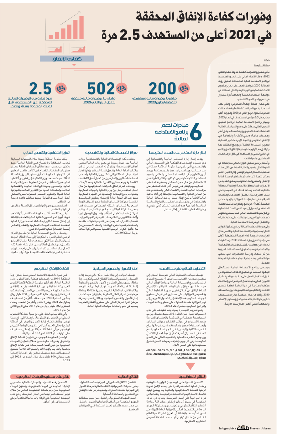 ففي مجال كفاءة الإنفاق الحكومي، والذي يعد أحد مبادرات برنامج الاستدامة المالية، فقد حققت الحكومة وفورات بحلول الربع الثاني من2021 أعلى بما يعادل 2.5 مرة من المستهدف في العام 2023.
