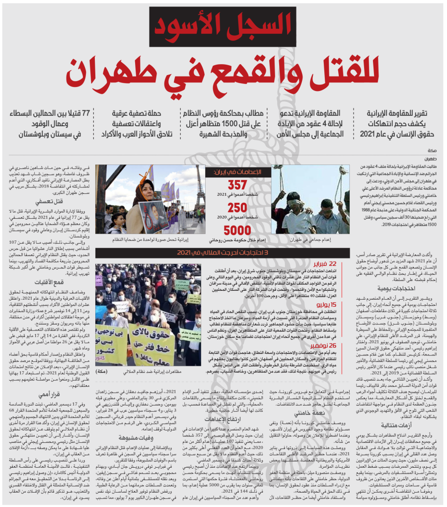 تقرير للمقاومة الإيرانية يكشف حجم انتهاكات حقوق الإنسان في عام 2021 المقاومة الإيرانية تدعو لإحالة 4 عقود من الإبادة الجماعية إلى مجلس الأمن مطالب بمحاكمة رؤوس النظام على قتل 1500 متظاهر أعزل والمذبحة الشهيرة حملة تصفية عرقية واعتقالات تعسفية تلاحق الأحواز العرب والأكراد 77 قتيلا بين الحمالين البسطاء وعمال الوقود في سيستان وبلوشستان