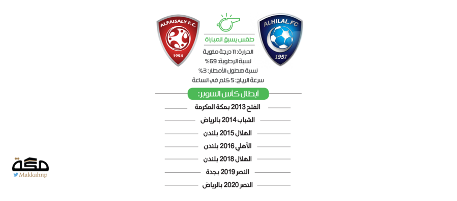 يطمح الهلال لرفع عدد مرات فوزه بلقب السوبر السعودي إلى 3 ألقاب بعد أن فاز به مرتين، عندما يواجه عند الـ8:15 مساء اليوم بملعب الأمير فيصل بن فهد، فريق الفيصلي الذي يحلم بتحقيق اللقب للمرة الأولى.