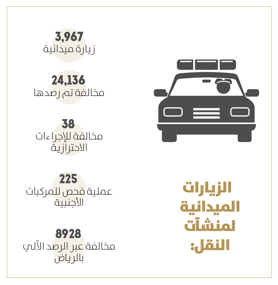 ونفذت الهيئة العامة للنقل ممثلة بالإدارة العامة للرقابة وبالتعاون مع الجهات المعنية كوزارة الداخلية والأمن العام ومركز السلامة المرورية حملات رقابية ميدانية نتج عنها (168,034) إجمالي عمليات الفحص خلال شهر يناير 2022م، منها (163,842) عملية فحص لمركبات النقل.