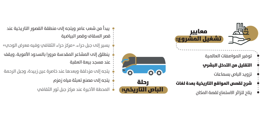 تعتزم الهيئة الملكية لمدينة مكة المكرمة والمشاعر المقدسة إطلاق المسار الأول للباص التاريخي خلال العام الحالي 2022 ، والذي سيمر على شرق مكة المكرمة والمشاعر المقدسة، ويضم 9 محطات، تنتهي عند مركز جبل ثور الثقافي، ويغطي هذا المسار 30 موقعا تاريخيا.