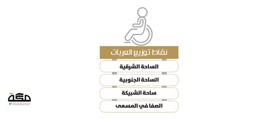 خصصت الرئاسة العامة لشؤون المسجد الحرام والمسجد النبوي 7 نقاط لتوزيع العربات اليدوية للمعتمرين من كبار السن وذوي الإعاقة بالمسجد الحرام، منها 4 نقاط توزيع مجانية، و3 نقاط توزيع عربات يدفعها المتطوعون ومرافقو المعتمرين من كبار السن أو ذوي الإعاقة.