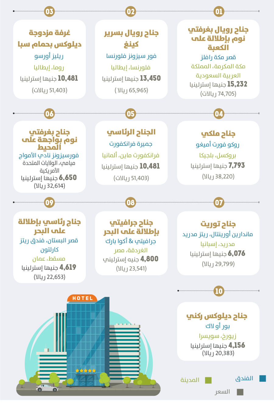 استعرض موقع (سليب سيكر) قائمة بأفخم وأغلى غرف الفنادق في العالم، حيث تصدرت غرفة في أحد فنادق مكة أعلى القائمة بكونها أغلى غرف الفنادق في العالم، حيث تبلغ تكلفة الإقامة بها أكثر من 15 ألف جنيه إسترليني، أي ما يعادل أكثر من 74 ألف ريال لليلة الواحدة.