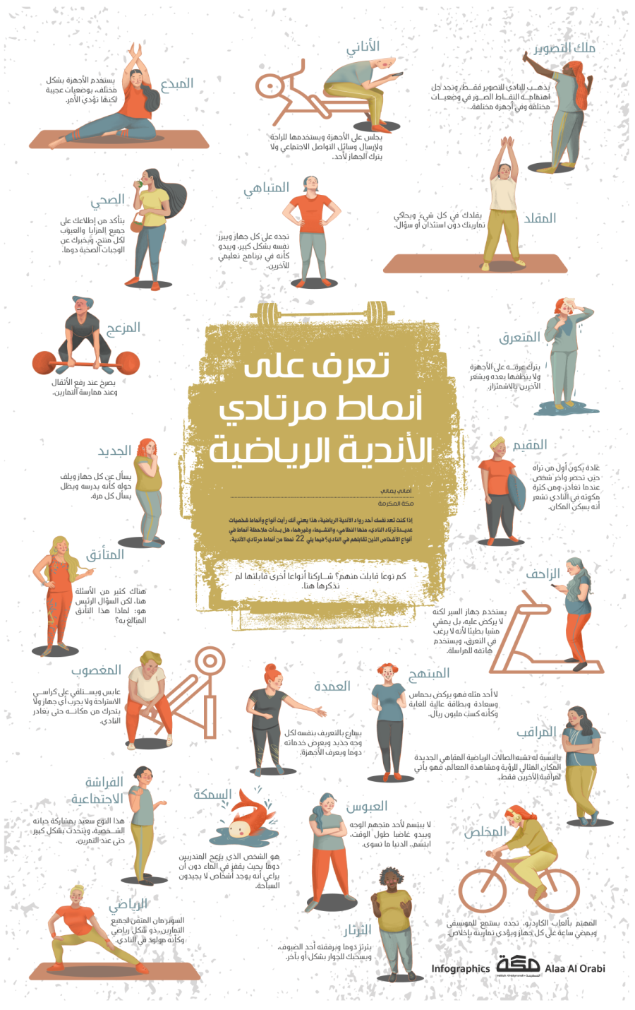 إذا كنت تعد نفسك أحد رواد الأندية الرياضية، هذا يعني أنك رأيت أنواع وأنماط شخصيات عديدة ترتاد النادي، منها النظامي، والنشيط، وغيرهما، هل بدأت ملاحظة أنماط في أنواع الأشخاص الذين تقابلهم في النادي؟ فيما يلي 22 نمطا من أنماط مرتادي الأندية.