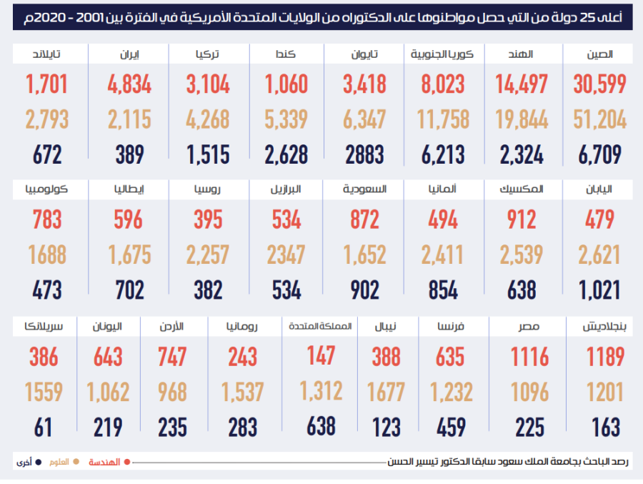 احتل السعوديون المركز 12 عالميا والأول عربيا خلال الـ19 عاما الماضية بين 2001م - 2020م من حيث حصول المواطنين السعوديين على درجة الدكتوراه من الولايات المتحدة الأمريكية، وذلك بحسب رصد الباحث والمستشار في الجودة والتطوير سابقا في جامعة الملك سعود بالرياض الدكتور تيسير الحسن.